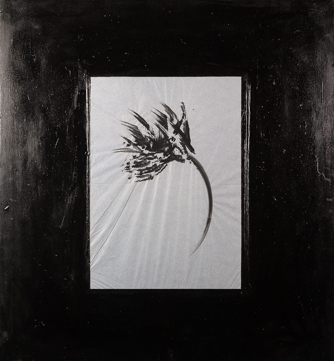 tempera nera da muro su carta velina,carboncino,matita,nastro carta,vernice lucida finale,