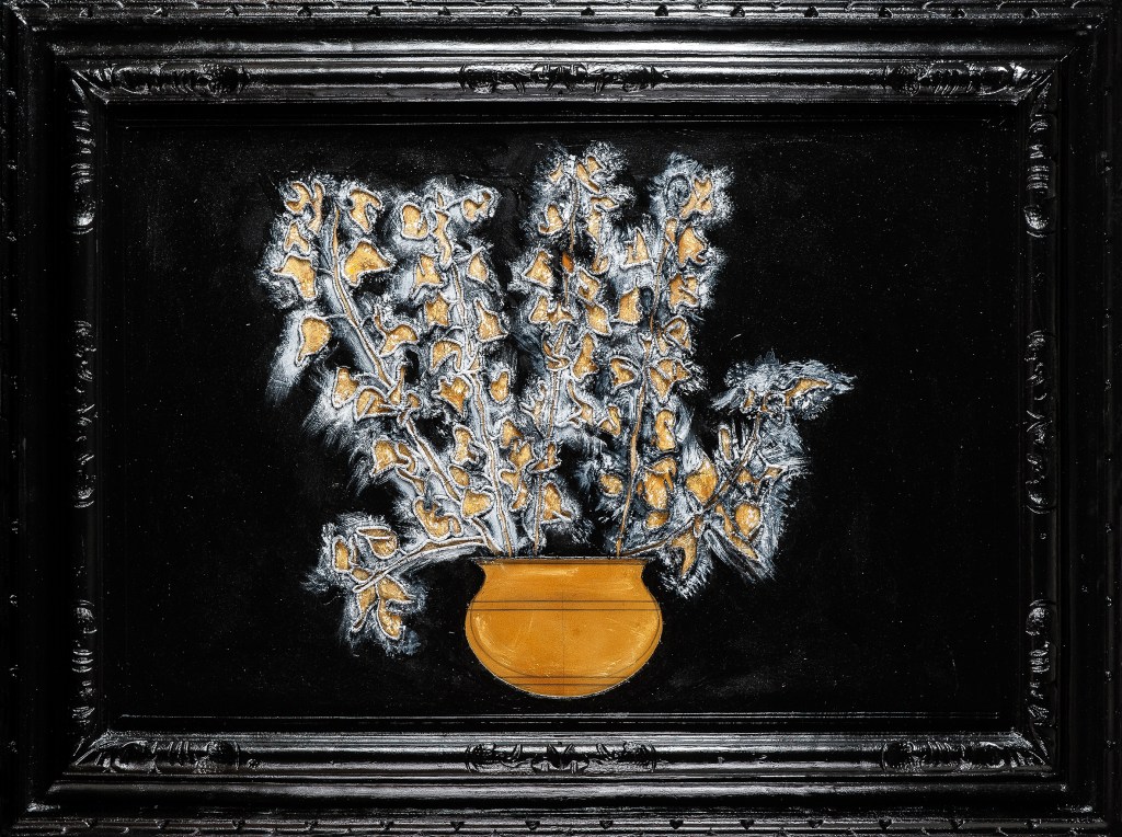 tempera da muro,giallo da vetro,matita nera,vernice lucida finale,corda cucita su cotone