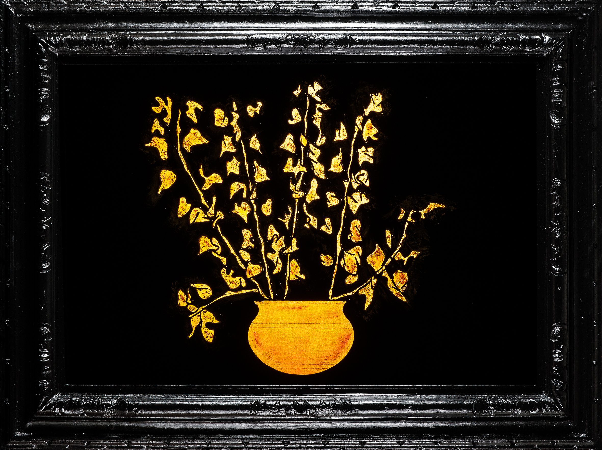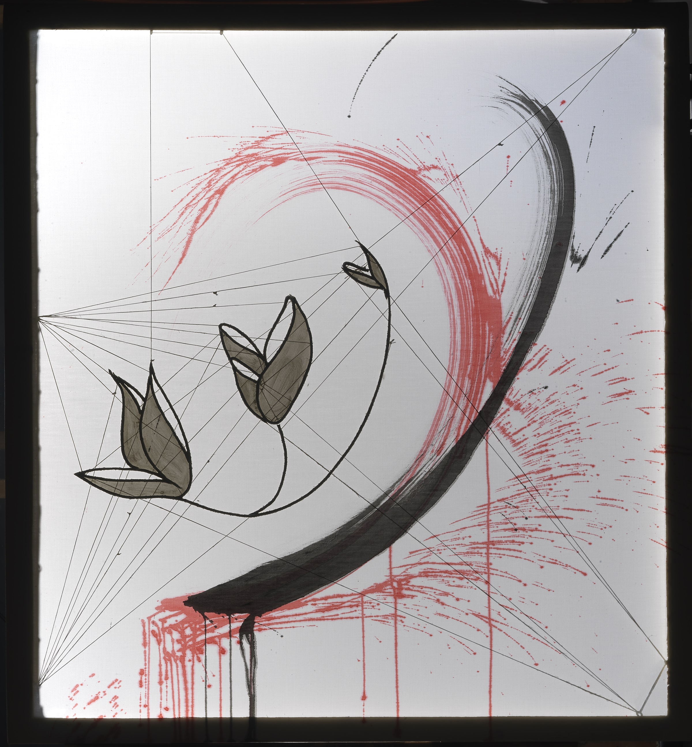 tempera da muro,giallo da vetro,matita nera,vernice lucida finale,corda cucita su cotone