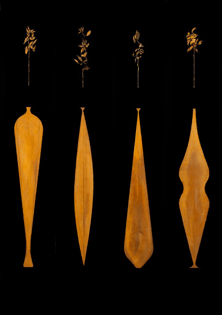 carboncino e acrilico su tela giallo-oro