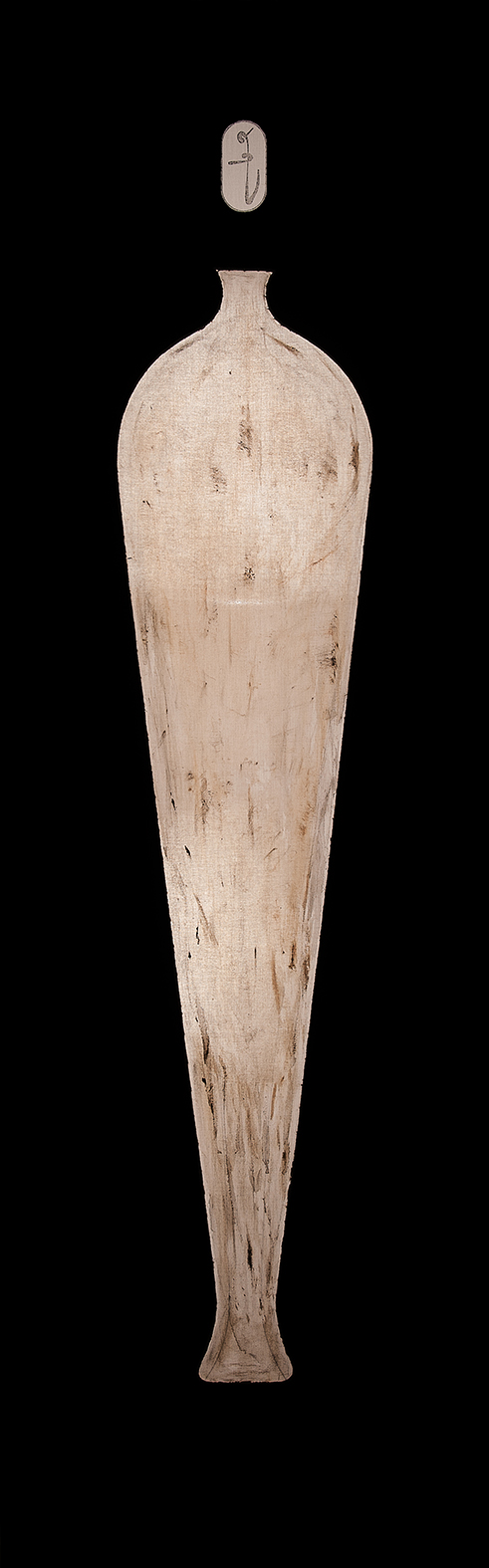 Carboncino, timbri-cartigli di Isse, tempera da muro, su antico lenzuolo di lino;