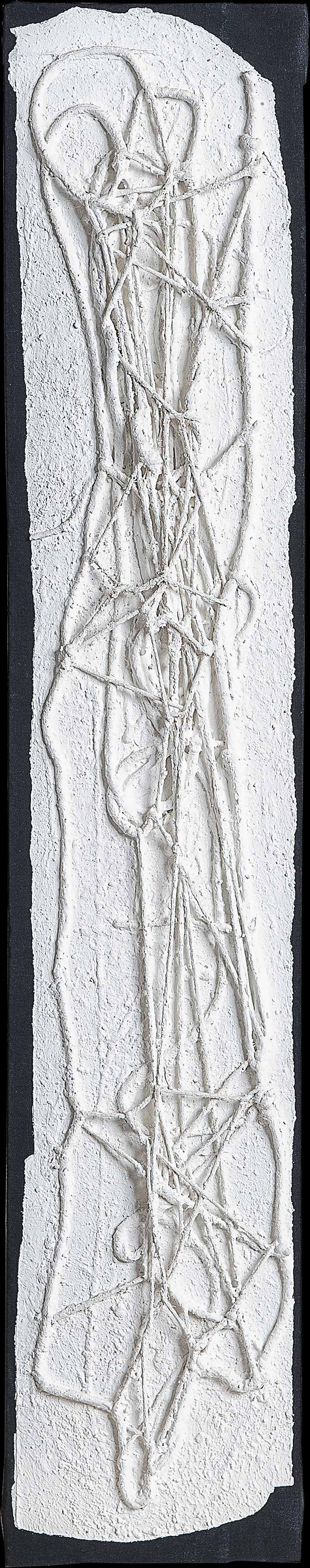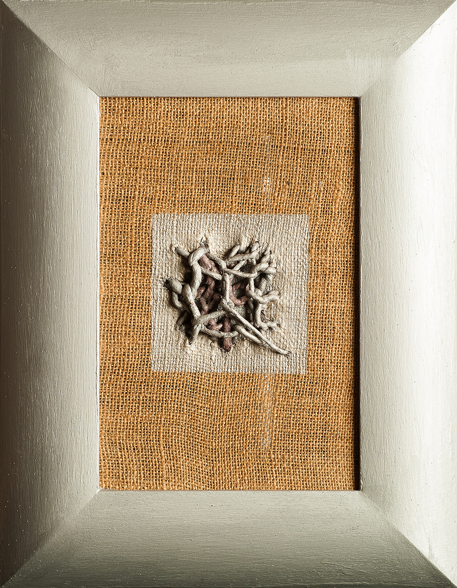 tempera da muro e spago cucito su tela di crema sgranata