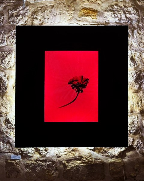 Une lumière électromagnétique, parmi les plus rapides, atteint l’œil : c’est le rouge qui capte l’attention. Jaillissant d’un cadre sombre, il est chaud, oriental, et habille trois gestes noirs. Ces gestes racontent la poésie d’une fleur. Racine, tige et feuille se développent en modules, une danse exprimée par les vers délicats d’un poème.