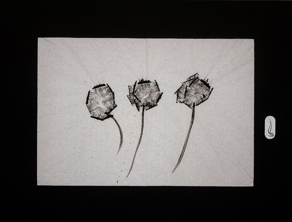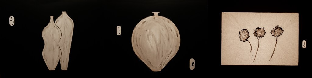 Le miroir des petites tables, habillées des mêmes teintes, sont le dos, les genoux et le bassin : des architectures anciennes comme des pyramides, complexes comme des étoiles. Un triptyque, tel un haïku, raconte la construction des corps et leur mouvement, qui culmine en une danse. Dans les cartouches d’André, se cachent les secrets de la conception de l’œuvre.