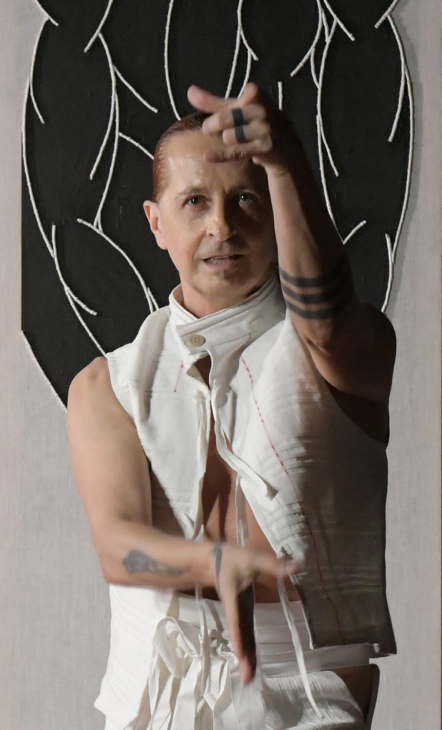 dalla PERFORMANCE del 3.10. 2025 alla Vernice della Personale André Che Isse “LA LUCCICANZA D’ALMA” a LART Gallery; André Che Isse fotografato da PLUKY